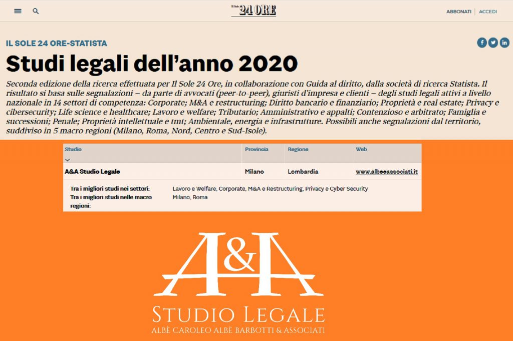 A&A SEGNALATO NELLA RICERCA “STUDI LEGALI DELL’ANNO 2020” DE IL SOLE 24ORE E STATISTA