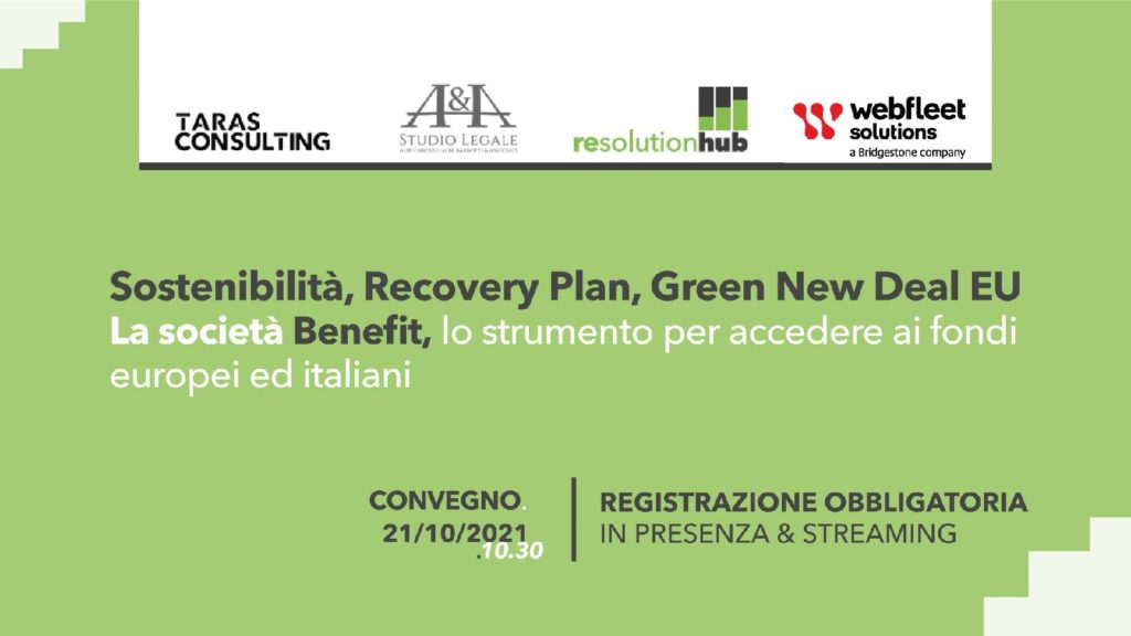 Giovedì 21 ottobre 2021 si terrà l’evento “Sostenibilità, Recovery Plan, Green New Deal EU – La Società Benefit lo strumento per accedere ai fondi europei ed italiani”. Il convegno si svolgerà sia in streaming sia in presenza: l’incontro dal vivo si terrà presso la “Sala Tramogge – Molini Marzoli Massari” di Busto Arsizio (capienza massima […]