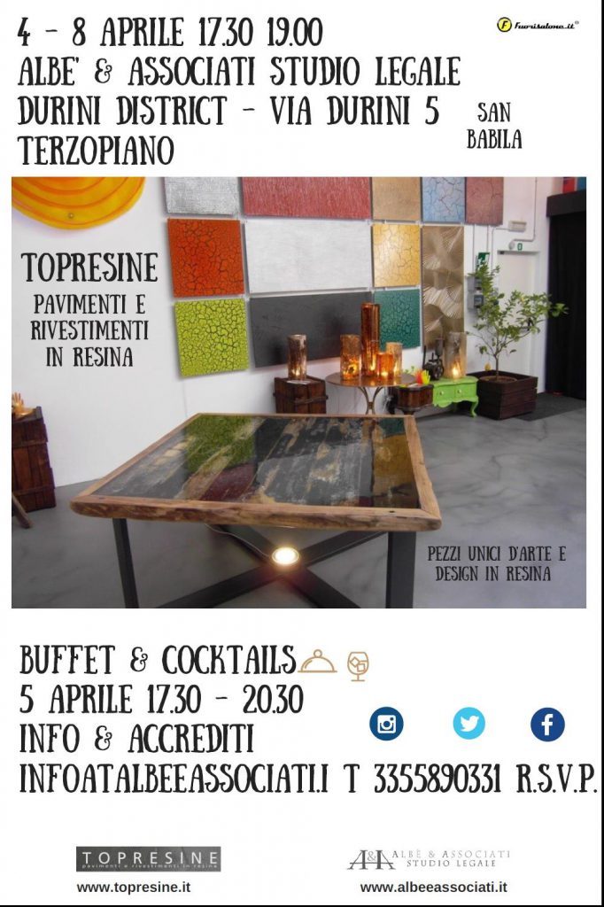In occasione del FUORI SALONE, ecco l’appuntamento presso lo studio di via Durini 5…DA NON PERDERE! 5 APRILE Dalle 17.30 alle 20.30 BUFFET & COCKTAILS Top Resine, leader nella realizzazione di pavimentazioni in resina per negozi, show-room, appartamenti ed uffici, la invita a conoscere l’azienda e le proprie opere artistiche. Fra cui, in particolare, installazioni, […]
