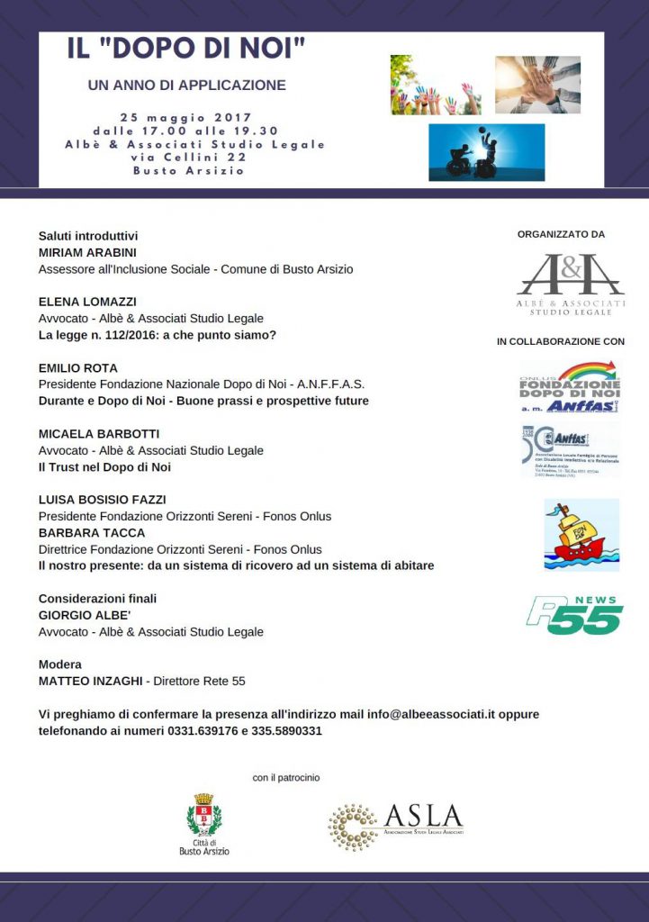 Abbiamo il piacere di comunicare che organizzeremo il convegno Si terrà giovedì 25 maggio, dalle ore 17.00 alle ore 19.30 ca., presso la sede di Busto Arsizio, via Cellini n. 22 Per una migliore organizzazione dell’evento, preghiamo cortesemente di confermare la presenza all’indirizzo mail info@albeeassociati.it oppure telefonando ai numeri 0331.639176 e 335.5890331 Programma da scaricare […]