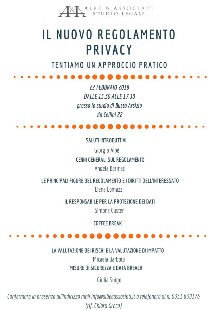 Considerato il successo del convegno del 22 febbraio scorso “IL NUOVO REGOLAMENTO PRIVACY – tentiamo un approccio pratico”, abbiamo pensato di replicare l’evento mercoledì 28 marzo 2018, dalle ore 15.00 alle 17.30, presso la sede di via Cellini 22 a Busto Arsizio. Per una migliore organizzazione dell’evento, preghiamo cortesemente di confermare la presenza all’indirizzo mail […]