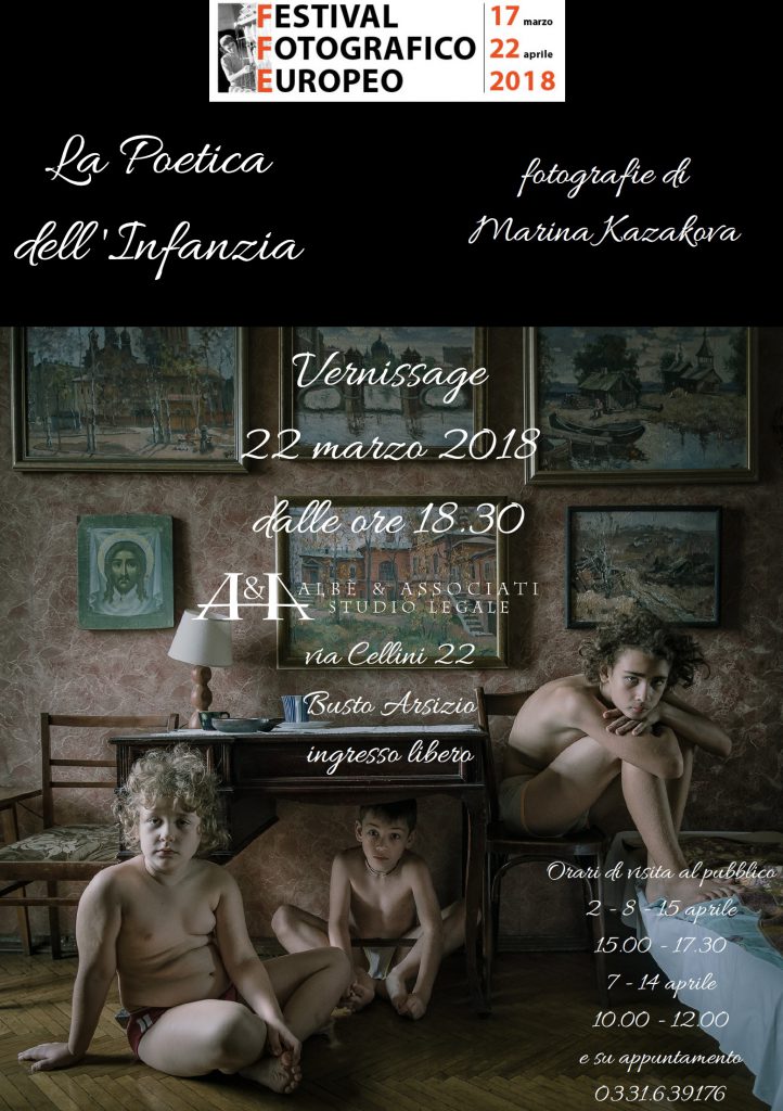 In occasione del Festival Fotografico Europeo, ideato ed organizzato da AFI – Archivio Fotografico Italiano, ospiteremo in studio a Busto Arsizio (via Cellini 22), dal 22 marzo al 15 aprile, la mostra fotografica La Poetica dell’Infanzia di Marina Kazakova – Vincitrice Premio Portfolio Afi 2017. Il vernissage si terrà giovedì 22 marzo dalle ore 18.30, […]