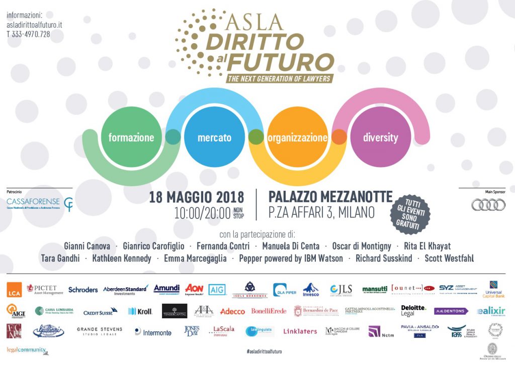 SAVE THE DATE 18 MAGGIO 2018 Asla Associazione Studi Legali Associati, organizza DIRITTO AL FUTURO, l’evento più sensazionale dell’anno, che si terrà venerdì 18 maggio 2018, presso Palazzo Mezzanotte – sede della Borsa Italiana. Le quattro grandi aree dell’evento sono: Organizzazione, Formazione, Mercato e Diversity. Maggiori info qui Siamo davvero orgogliosi di essere tra gli […]