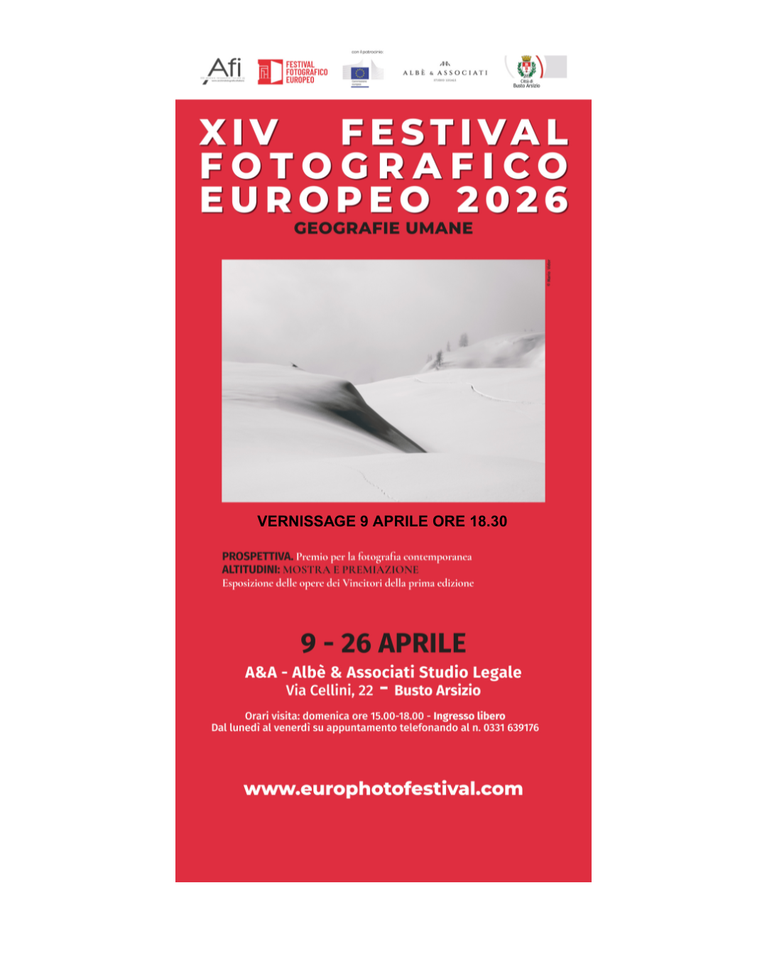 La serata di premiazione si terrà giovedì 9 aprile 2026 alle ore 18:30 presso la sede di A&A – Albè & Associati, in Via Cellini 22 a Busto Arsizio. In questa occasione saranno annunciati i tre vincitori del concorso e sarà inaugurata la mostra a loro dedicata.